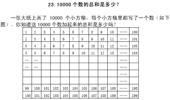 分析與解要求這10000個數的總和,我們可以把每一橫行(行)或每一豎行(列)的100個數的和分別計算出來,然后再求出這100行或100列的總和,就是10000個數的總和。不過這樣計算太復雜了。