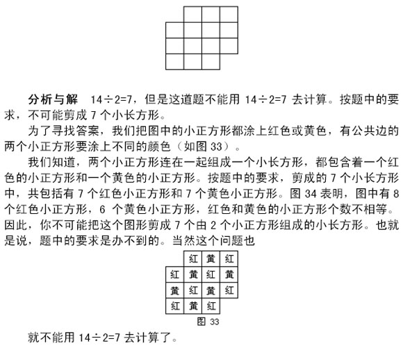 下圖由14個小正方形組成。你能把它剪成7個由2個小正方形連在一起組成的小長方形嗎?這沒問題,因為14÷2=7,一定能剪成7個小長方形。